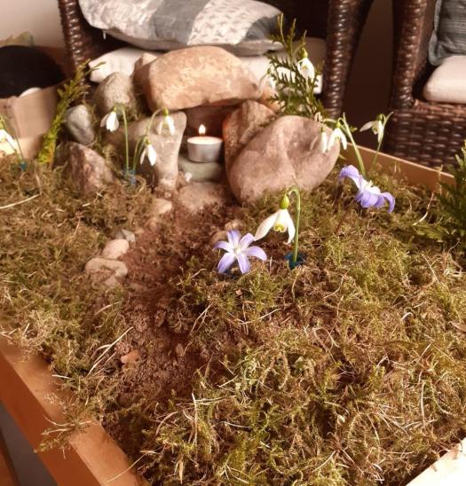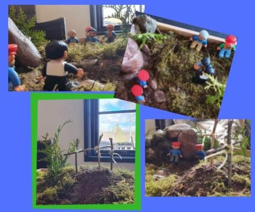 Vi försöker uppleva påsk händelser med barnen. Tillsammans med dem skapade vi ett litet ”påsk-landskap”. Men först av allt behövde vi ett hus med ett stort bord med Jesus och sina vänner. För barnen är det jättebra om man läser utifrån ”Stora Berätterbibeln” (Argument förlaget). Det är jättekommunikativ.